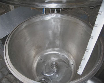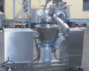 Рабочая емкость (чаша) машины расположена на поворотных опорах с электроприводом (для полной выгрузки продукта) и имеет рубашку для нагрева и охлаждения продукта.