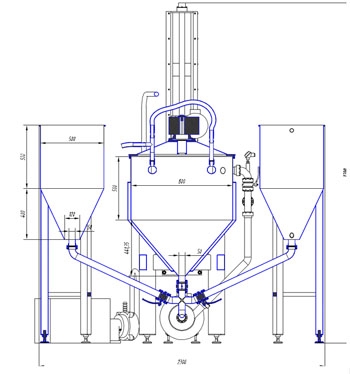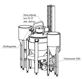 Устройство. Этот вакуумный миксер-гомогенизатор представляет собой котел с коническим днищем и опоясывающей рубашкой на цилиндрической и конической поверхностях. Внутри расположена якорно-лопастная скребковая мешалка, которая хорошо перемешивает продукт и одновременно соскребает его со стенок. На крышке расположен привод мешалки, штуцера подвода вакуума и моющих растворов, манометр, люк со стеклом и смотровое окно. В базовом варианте вакуумный миксер-гомогенизатор уже включает в себя две емкости для компонентов, гомогенизатор, вакуумный насос, подъемник крышки, пульт управления обвязанные и отрегулированные для начала работы.Принцип работы. Снизу, под чашей, на выходе из конуса, расположен гомогенизатор, который играет роль смесителя-измельчителя. Продукт, попадая в гомогенизатор, проходит через узкие, постоянно сменяющиеся зазоры ротора и статора и возвращается обратно в чашу. Гомогенизатор имеет один основной вход из конуса чаши и 3 вспомогательных входа. Вспомогательные входы служат для ввода необходимых ингридиентов в общий объем продукта. К вспомогательным входам подключаются воронки или необходимые емкости. Выгружается готовый продукт также при помощи диспергатора. Только в случае, если Вы хотите получить продукт с неизмельченными твердыми компонентами, выгрузка производится подключаемым снизу насосом. Схема устройства вакуумного гомогенизатора серии ВМГ-Корума
