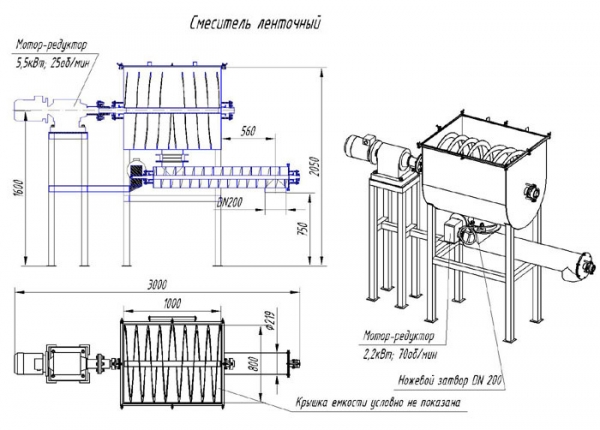 Смеситель ленточный 1000л (геом), 600л (раб) для сыпучих продуктов, разгрузка затвор эксцентриковый и шнековая выгрузка, загрузка люк, рабочая камера из пищевой нержавеющей стали, крышка откидывающаяся с противовесом (либо пневматические амортизаторы), концевой выключатель при открытой крышке, станина Ст3 (финкраска) на рег. опорах.